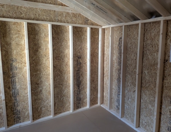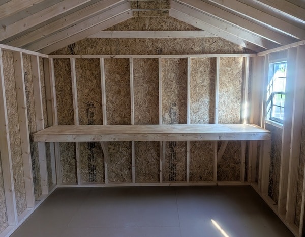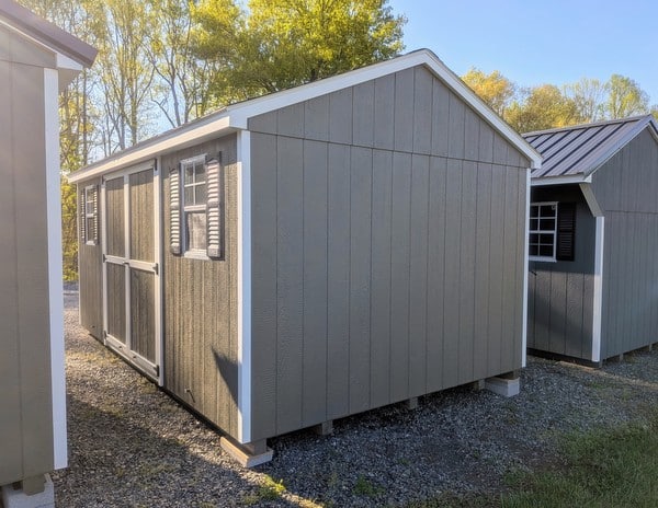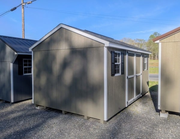 This Painted A-Roof Shed Has Clay Siding, White Trim, Black Architectural Shingle Roof and Black Shutters. The extra features it comes with is (1) 10′ Workbench, (1) 8′ Ridge vent, Good’s Garden Sheds 6′ Double Doors and L P Pro Struct Flooring up-grade.