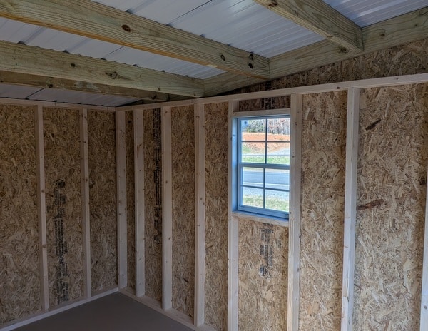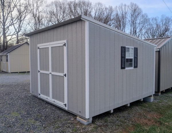 This Painted Economy Shed Has Gap Gray Painted Siding, White Trim, Alamo Metal Roof and Black Shutters. The extra features it comes with is GGS 6′ Double Doors and L P Pro Struct Flooring up-grade.