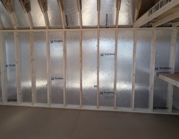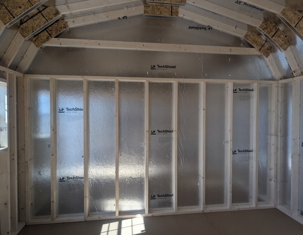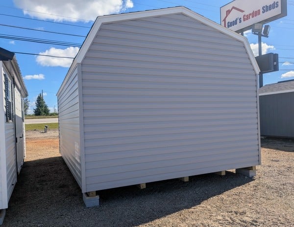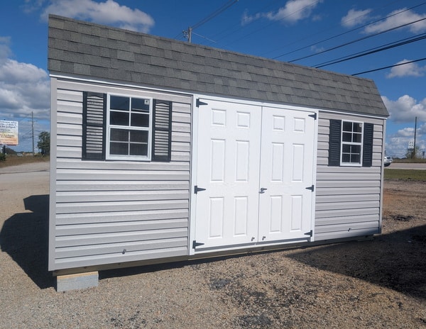 This Vinyl High Barn Shed has Flint Siding, White Trim, Estate Gray Architectural Shingle Roof and Black Shutters. The extra features it comes with is (1) 8′ Ridge vent, (1) 12′ Loft, (1) 12′ Workbench, Tech Shield on the Walls and L P Pro Struct Flooring upgrade.