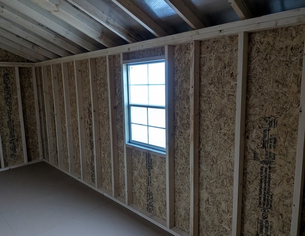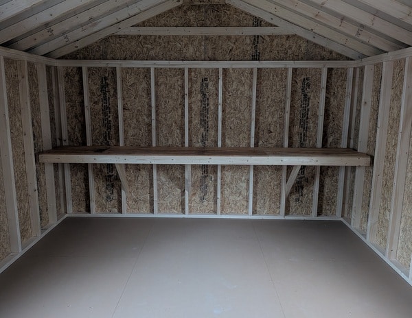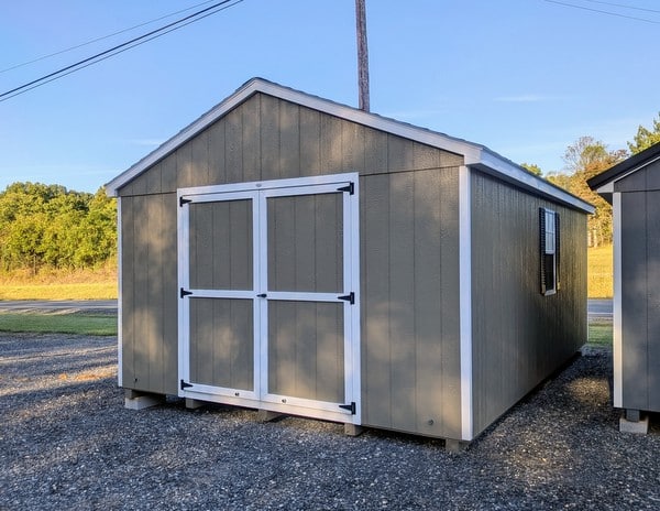 This Painted A-Roof Shed Has Clay Painted Siding, White Trim, Driftwood Architectural Shingle Roof and Black Shutters. The extra features it comes with is (2) 8′ Ridge vents, (1) 12′ Workbench, GGS 6′ Double Doors and L P Pro Struct Flooring up-grade.