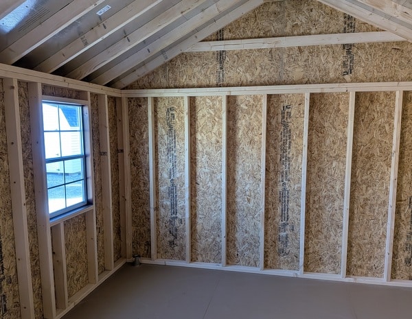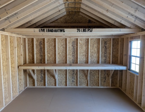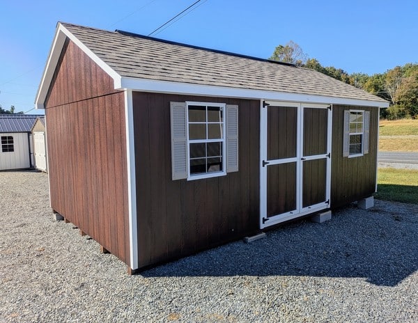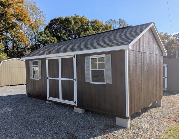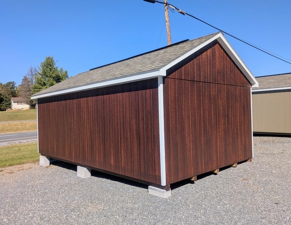 This Painted Classic Shed Has Stain Mahogany Siding, White Trim, Driftwood Architectural Shingle Roof and Clay Shutters. The extra features it comes with is (2) 8′ Ridge vents, (1) 12′ Loft, (1) 12′ Workbench, GGS 6′ Double Doors and L P Pro Struct Flooring up-grade.