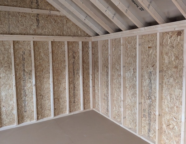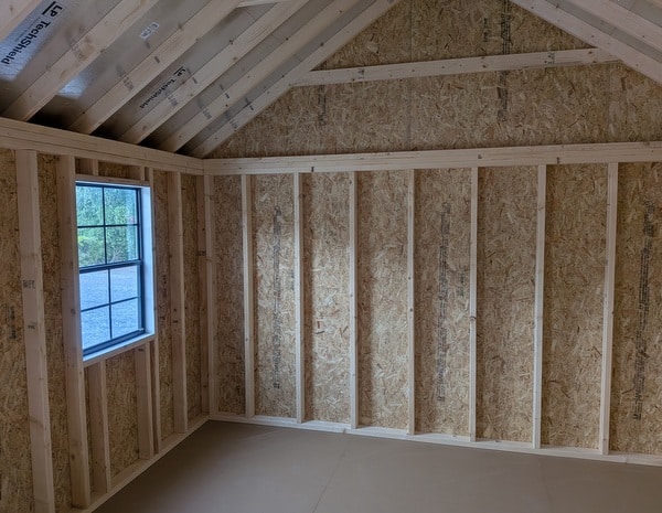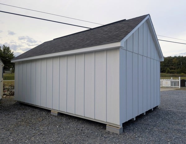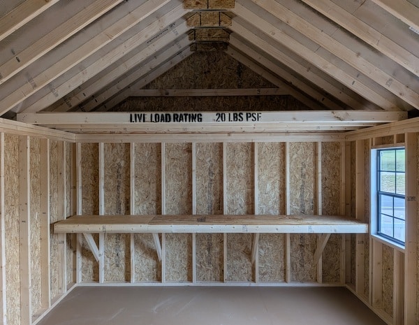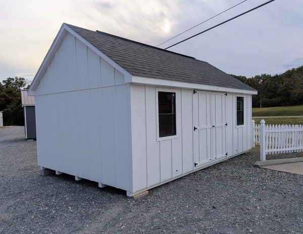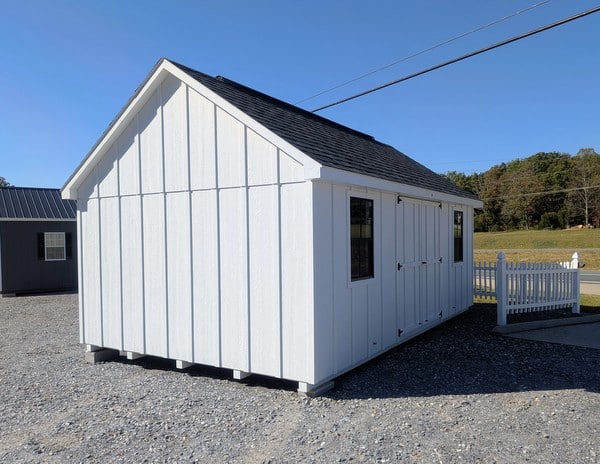 This Painted A-Roof Shed Has White Painted Board & Batten Siding, White Trim, Black Architectural Shingle Roof and White Trim Boards around Windows. The extra features it comes with is (2) 8′ Ridge vents, (1) 12′ Loft, (1) 12′ Workbench, GGS 6′ Double Doors and L P Pro Struct Flooring up-grade.