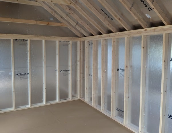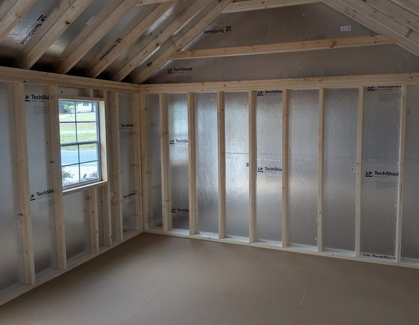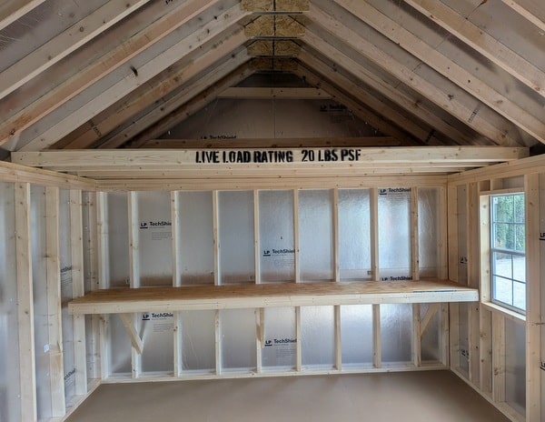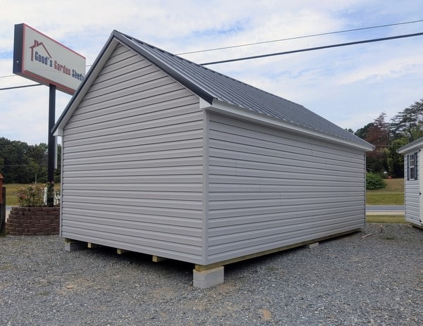 This Vinyl Garden Shed has Flint Siding, White Trim, Black Metal Roof and Black Shutters. The extra features it comes with is (1) 12′ Loft, (1) 12′ Workbench, Tech Shield on the Walls, Fiber Transom 6′ Double Shed Doors and L P Pro Struct Flooring upgrade.