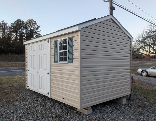 This Vinyl A-Roof Shed has Tan Siding, White Trim, Brownwood Architectural Shingle Roof and Green Shutters. The extra features it comes with is (1) 8′ Ridge vent and L P Pro Struct Flooring upgrade.